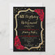 Convite de Festa de Aniversário e Aposentadoria. Design elegante em preto, dourado e vermelho. Apresenta fonte de letra estilosa, dourado com brilho falso e confetes. Perfeito para uma celebração conjunta de aniversário e aposentadoria glamorosa. Personalize com seus próprios detalhes.