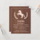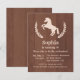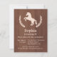 Um convite de aniversário elegante e moderno com uma silhueta de um cavalo com folhas decorativas como a grinalda. Uma textura de madeira para o fundo. Aperfeiçoe para os meninos e as meninas do aniversário que amam cavalos! Personalize facilmente com seus detalhes do partido.