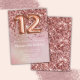 Convite de aniversário elegante rosa de 12 de ouro para uma menina de 12 anos com roteiro elegante escrevendo e balões de folha divertida.
