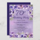 O violeta púrpura elegante viola o design de "Festa de aniversário 70" floral, com uma faixa floral superior e inferior de violetas em um violeta angustiado e fundo de poeira branca.