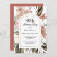 Celebrar um importante aniversário com este maravilhoso e belo convite de aniversário floral de 80 rústico boho aquarela. Ele tem uma paleta de cores neutras em bege, verde, pêssego, e tons de rosa e terracota. Um belo quadro arqueado com sotaque dourado adiciona elegância ao design. O verso do convite é a coordenação da cor sólida terra-cotta quente. Personalize o modelo de texto com os detalhes do evento. Observe que este design está disponível como um convite impresso E um convite para download digital para sua conveniência.