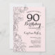 Convite de aniversário 90 Floral Cor-de-Rosa Esbranquiçada. Design minimalista moderno com desenhos botânicos em destaque e letra de script de tipografia. Simples trendy convida cartão perfeito para uma festa de na moda. Pode ser personalizado para qualquer idade. Impressos convites Zazzle ou modelo de impressão digital instantânea para download.