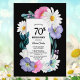 Um vibrante convite de aniversário floral, bordado a preto, com flores rosadas e roxas, margaridas brancas e verde à volta do texto.