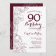 Convite de aniversário de 90 floral brilhante. Elegante design no vinho de marsala e branco com desenhos botânicos desenhados em destaque e letra tipografia. Simples trendy convida cartão perfeito para uma festa de na moda. Pode ser personalizado para qualquer idade. Impressos convites Zazzle ou modelo de impressão digital instantânea para download.