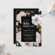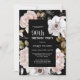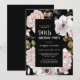 Um convite de aniversário floral elegante, este design apresenta fundo preto para contrastar maravilhosamente com as rosas cor-de-gelo de inverno que enquadram o texto. Todo o texto pode ser personalizado com o texto de sua parte personalizada, incluindo a idade. Você também pode usar este modelo de convite para outras idades personalizando o número 90 para o número de idade desejado.