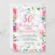 Este convite de aniversário floral tropical apresenta lindas peônias e rosas em tons de rosa e roxo, com verde teal atrás de uma camada de branco, com uma estrutura recortada para os detalhes do seu partido em tipografia rosa e lacrimogênea. Um grande "80" em cor-de-rosa-menina com aspersores é o ponto focal. A parte traseira do cartão tem um padrão floral correspondente. Desenhada pela artista Susan Coffey.