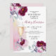Um elegante convite de na moda, que inclui um vidro de champanhe floral, florais cor-de-rosa e burgundy, e um fundo de lavagem de aquarelas em tons cor-de-rosa, com um nome de assinatura de script elegante. Na moda e moderno.