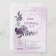 Belo convite de aniversário botânico com lavanda roxa e flores brancas com folhas verdes em um círculo verde formando uma bonito coroa romântica. PARA MAIS PRODUTO CORRESPONDENTE, clique na coleção acima ou entre em contato comigo.