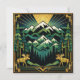 Este design arrojado de festa de aniversário apresenta uma impressionante paisagem montanhosa Art Deco emoldurada por bordas geométricas em tons de verde escuro, azul-marinho e dourado. Picos cobertos de neve se erguem sob linhas radiantes de raios de sol, enquanto árvores altas e perenes criam uma paisagem florestal simétrica. Dois alces estilizados estão na base, adicionando um toque distinto de vida selvagem à composição. O painel central creme destaca letras em script elegante para "Festa de Aniversário", combinado com tipografia moderna e limpa para os detalhes do evento. Com suas linhas estruturadas e paleta de cores ricas, esta obra de arte combina o glamour vintage com o charme robusto ao ar livre para uma celebração sofisticada da floresta.