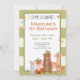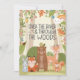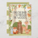 Animais da Floresta Façam Convites de festas de aniversários com texto personalizado. Um dos lados diz "Sobre o rio e Através da floresta" com um tema de floresta e coelho, raposa, urso, veado, esquilo, caracol e joaninha. Basta usar o botão "Personalizar" para adicionar seu próprio texto para personalizar este convite.