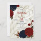 marinho romântico flores azuis e vermelhas e folhas de bronze de ouro no convite de aniversário botânico de fundo do mármore Os detalhes da brilha são simulados