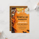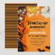 Convites de festa de aniversário infantil de Halloween com fundo laranja de outono, decoração de mesa de festa, abóboras, morcegos, luzes de corda e um modelo de festa de Halloween personalizado assustador que é fácil de personalizar.