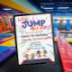convite de aniversário de vamos com crianças pulando em um trampolim.