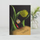 Uma jovem joaninha relaxa contra seu favorito (dandelion) com um sorriso grande em seu rosto. Mostrada contra um fundo de gradiente preto. Uma design para comemorar um aniversário de meninas.