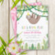 Celebre o aniversário do seu filho com esses convites de festas de aniversários de preguiça fofos! Com uma adorável preguiça pintada à mão em uma festa rosa e amarela pendurada na selva. Flores brancas, amarelas e cor-de-rosa decoram as folhas da selva. O fundo tem um padrão de folha de selva rosa.
