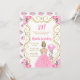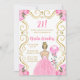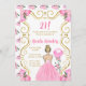 Este convite de aniversário apresenta uma elegante estrutura de ouro, uma bela princesa com cabelo louro e um vestido rosa, flores e um balão. Isto é perfeito para uma festa de aniversário.