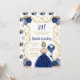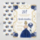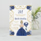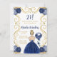 Este convite de aniversário apresenta uma elegante armação de ouro, uma bela princesa com cabelo louro e um vestido azul marinho, flores e um balão. Isto é perfeito para uma festa de aniversário.