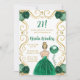 Este convite de aniversário apresenta uma elegante estrutura de ouro, uma bela princesa com cabelo louro e um vestido verde, flores e um balão. Isto é perfeito para uma festa de aniversário.