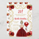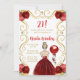 Este convite de aniversário apresenta uma elegante estrutura de ouro, uma bela princesa com cabelo louro e um vestido vermelho, flores e um balão. Isto é perfeito para uma festa de aniversário.