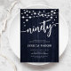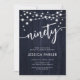 Convite de aniversário 90. Design russo com padrão de madeira marinho branca. Cartão de convite clássico com luzes de fada e fonte branca de script. Perfeito para uma comemoração de na moda 90 dias. Personalize com seus próprios detalhes. Pode ser personalizado para qualquer idade! Impressos convites Zazzle ou modelo de impressão digital instantânea para download.