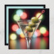 Um copo de martini cheio de um coquetel transparente é guarnecido com três azeitonas verdes num esquiador vermelho para uma festa de aniversário adulta. Todo o texto pode ser alterado.
