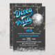 © Socialite Design Inc. & LICENSORS. Celebre uma festa de aniversário de discoteca convidando os convidados com este convite de aniversário divertido e retrô. As cores são prata, branca, azul neon e cinzas. O design incorpora uma bola prateada de disco e luzes douradas / cordas brancas como fundo.