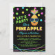 convite de aniversário legal para adolescentes e adolescentes com óculos escuros vestindo abacaxi com batom preto e folhas tingidas. Um confete colorido de neon e uma sensação de disco retrô. A parte traseira apresenta faixas correspondentes em amarelo, verde, magenta e azul.