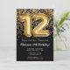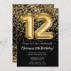Convite de aniversário preto e ouro elegante para uma menina de 12 anos com escrevendo de escrita elegante e balões de folha divertida.