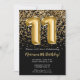 Convite de aniversário preto e 11 de ouro elegante para uma menina de 11 anos com script elegante escrevendo design de fonte dourada e balões de folha divertida.