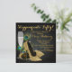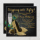 Penas de pavão elegantes, champanhe de ouro e calçado de salto alto com brilho dourado entrando em 50 convites de aniversário. Você pode personalizar facilmente este belo convite de aniversário de pavão adicionando seus detalhes no estilo de fonte e na cor, no texto e no layout de sua escolha.