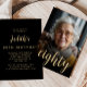 A frente deste convite de 80 de aniversário apresenta a foto do convidado de honra com uma camada de texto dourada. A palavra "oitenta" aparece num elegante roteiro de caligrafia dourada. Uma tela escura ajuda a tornar o texto pop. Personalize o lado inverso com o nome e os detalhes da parte em um plano de fundo preto. Uma forma excelente de celebrar alguém que está fazendo oitenta anos!