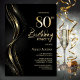 Convide seus amigos e entes queridos para o seu aniversário de 80 com este convite de aniversário preto e ouro na moda. A área de texto personalizável neste modelo de convite permite que você inclua facilmente todos os detalhes necessários para sua celebração especial de aniversário, incluindo as informações de data, hora, local e RSVP. Uma variedade de tipos de papel e estilos de canto estão disponíveis para seus convites exclusivos, juntamente com a opção de download se você preferir um formato digital.