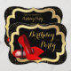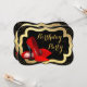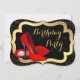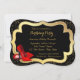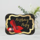 Convite de festa de aniversário elegante com sapatos vermelhos de salto alto, preto e dourado. Este convite de festa de aniversário vermelho, preto e dourado é facilmente personalizado para o seu evento.