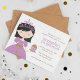 O tema da festa de aniversário adorável mostra uma doce ilustração de uma garotinha vestindo um vestido de princesa e uma tiara, segurando um cupcake.