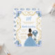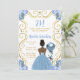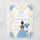 Este convite de aniversário apresenta uma elegante estrutura de ouro, uma bela princesa com pele escura e um vestido azul empoeirado, flores e um balão. Isto é perfeito para uma festa de aniversário.