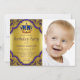Convite de aniversário real azul e dourado com coroa real azul e dourada sobre um belo fundo azul real e espiral dourado. Você pode personalizar facilmente este convite de aniversário real azul e ouro do rico para o seu evento simplesmente adicionando sua foto e detalhes do evento no estilo de fonte e na redação de sua escolha. Você também pode mover e remover a coroa do verso do convite e adicionar texto.