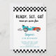 Cartaz de convite de aniversário do garoto com tema de corrida, ilustrando um carro vintage azul com chamas. O texto diz "pronto, pronto, vá! corra por aí."
