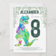 Crie o tema para celebrar o seu adorável aniversariante dinossauro com esta colorida e assustadora tirannosaurus rex Jurassic jungle dinossauro 8º convite de aniversário. Fácil de personalizar a tipografia verde-escura moderna com todos os detalhes da festa. Ilustração psicodélica única do dinossauro T-Rex e obra de arte original da folhagem da selva, da artista Catherine Sweetman