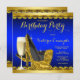 Calçados de salto alto, reais e dourados, com convites de festas de aniversários de salto alto, maravilhosos calçados de salto alto, brilhante em ouro, num elegante fundo azul real e amarelo. Este elegante convite de aniversário azul real e dourado é facilmente personalizado para o seu partido ou evento, adicionando detalhes do evento, estilo de fonte, tamanho de fonte e cor e texto. Este é um design impresso sem rendas reais, brilho, diamantes, etc.