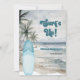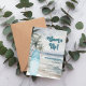 Um convite para uma festa de aniversário de praia retrô. Uma praia arenosa de cor aquática, ondas oceânicas e palmeiras como fundo, e uma prancha azul na praia.