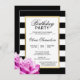 Trendy e moderno convite para modelos editáveis para Festas de aniversário para meninas/mulheres em listras brancas e negras. Moldura de ouro falsa com rosa rosa na esquina. Todo o texto pode ser editado e alterado; fonte, cor e tamanho. Entre em contato com o designer para obter outras variações ou ajuda.