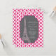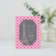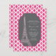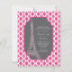 Convite de aniversário moderno para raparigas, adolescentes e mulheres jovens. Padrões cor-de-rosa claro e branco sobre o fundo, com uma etiqueta de cinza escura e uma torre de eiffel rosa.