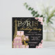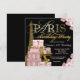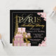 Convite de festa de aniversário de Paris com bela Torre Eiffel dourada, elegantes pacotes de presentes de Paris, sapatos de salto alto dourados e elegante texto dourado de Paris em um rico fundo floral rosa e preto. Este lindo convite de festa de aniversário de Paris é facilmente personalizado para o seu evento, basta adicionar seus detalhes no estilo de letra e cor, e texto de sua escolha. Este é um design impresso sem diamantes, joias, lantejoulas, etc. reais.