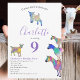 Uma coleção de ilustrações coloridas de cabras de aquarela em rosa, roxo, azul, laranja, amarelo e aqua vibrante. Um belo convite de aniversário de animais de criação 9º com cabras bebês e cabras em cabras. Este convite de festas divertido é fácil de personalizar para criar um convite de festas único adequado para crianças e amantes adultos de cabras. Exemplares originais de cabra psicodélica rosa colorida da artista Catherine Sweetman