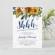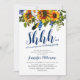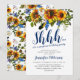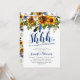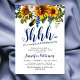 Convites de festa de aniversário surpresa boho azul e amarelo com um fundo branco clássico que pode ser alterado para qualquer cor, uma exibição floral de girassol aquarela, penas e um modelo de convite de celebração de aniversário elegante.