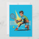 Uma ilustração vibrante da arte do pop, que mostra uma ação de médio jovem jogador de tênis masculino. O atleta é capturado em uma pose dinâmica e agitada, segurando poderosamente uma raquete e uma bola de tênis, renderizada em uma paleta impressionante de tons elétricos azuis, laranja claro, verde vibrante e amarelo ensolarado. Ele está posicionado ligeiramente fora do centro contra um fundo azul elétrico adornado com pontos de meia-tona e padrões clássicos de Ben-Day, enquanto uma grade estilizada de tênis subtilmente sobreposta adiciona uma camada de profundidade. Um holofote solteiro destaca o garoto e sua raquete, lançando sombras vivas e angulares e criando um senso de energia cinética dentro da cena.