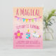 Um convite de aniversário para o seu filho de três anos, este design apresenta um fundo cor-de-água rosa com "A Magical Birthday" escrito em gráficos e fontes adoráveis. Abaixo está um exemplo de texto "Tiffany is turn" com uma vela de aniversário "3" acesa a azul. Compre seu convite de aniversário de unicórnio hoje!