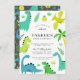 Stomp, chomp e rugido! O que é melhor que um dinossauro? Esses convites bonitos apresentam detalhes de sua festa na tipografia moderna enquadrada por dinossauros, folhas, plantas de cacto e palmeiras. Estas cartas invertem para um padrão de dinossauro correspondente. Edite o texto nas caixas modelo para personalizar.
