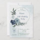 Belo convite de aniversário botânico, com flores brancas, poeirentas, azuis e marinhos azuis, com folhas verdes num círculo verde, formando uma bonito coroa romântica. PARA MAIS PRODUTO CORRESPONDENTE, clique na coleção acima ou entre em contato comigo.