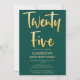 Introduzir um novo convite de aniversário 25 moderno e elegante, fundo verde esmeraldo com texto tipográfico dourado escrito à mão "vinte e cinco". Personalize esta placa de modelo, adicionando as informações de sua própria parte.